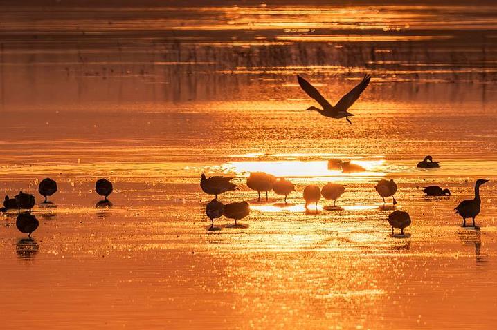 △夕阳下,河北张家口察北一湖泊宛如童话世界,小天鹅、大雁、翘鼻麻鸭等各种秋季迁徙的水鸟在水中嬉戏,在空中自由飞翔。