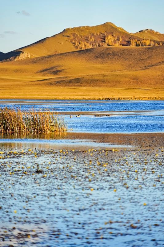 △秋天的内蒙古乌兰布统大草原将军泡子景区一片金黄色,与蓝色的湖水交相辉映。