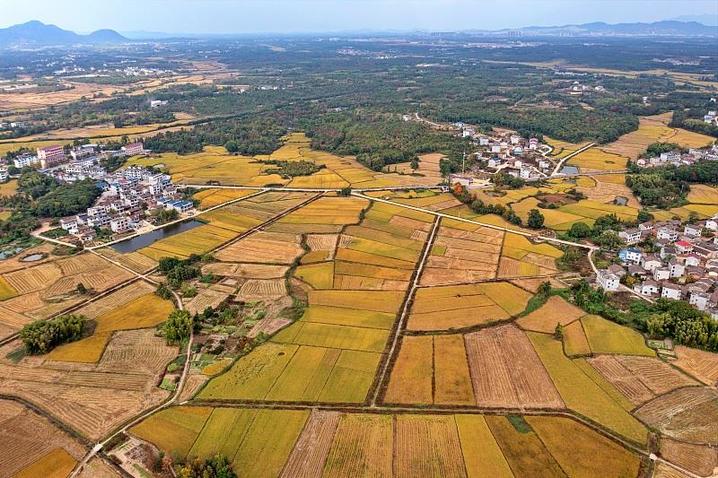 △江西抚州金溪县琅琚镇陈源村一带,金黄的稻田与民居、公路、青山等相映成趣,构成一幅丰收画卷。