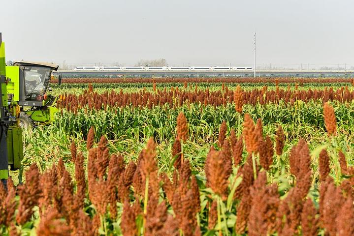 △安徽亳州谯城区古城镇张桥村,村民在红高粱基地内收获高粱。