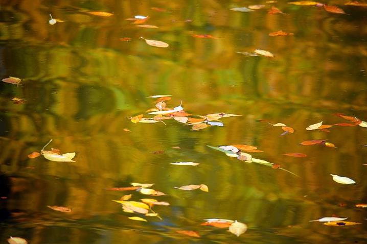 △新疆乌鲁木齐市人民公园湖面上的落叶,色彩斑斓秋意渐浓。