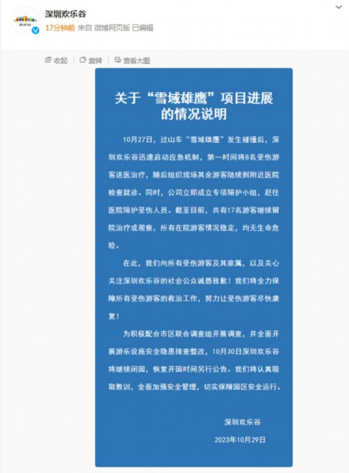 据深圳欢乐谷官方微博消息,深圳欢乐谷29日发布《关于“雪域雄鹰”项目进展的情况说明》称,向所有受伤游客及其家属,以及关心关注深圳欢乐谷的社会公众诚恳致歉,将全力保障所有受伤游客的救治工作,努力让受伤游客尽快康复。为积极配合市区联合调查组开展调查,并全面开展游乐设施安全隐患排查整改,10月30日深圳欢乐谷将继续闭园,恢复开园时间另行公告。