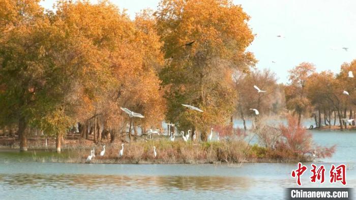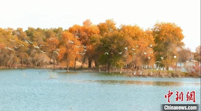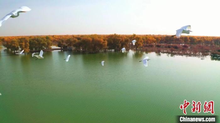 新疆罗布淖尔国家湿地公园碧水微澜映胡杨 鹭鸟欢飞生态美
