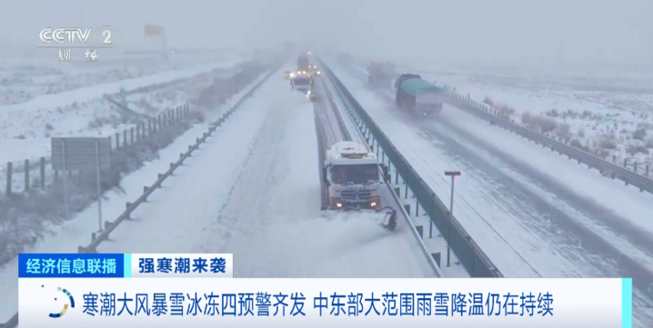 12月14日,中央气象台“四预警”齐发,包括寒潮橙色预警、大风蓝色预警、暴雪黄色预警和冰冻黄色预警。