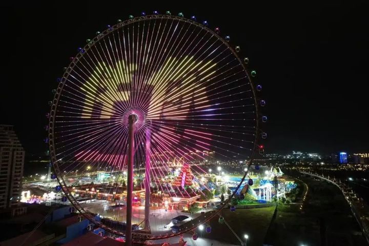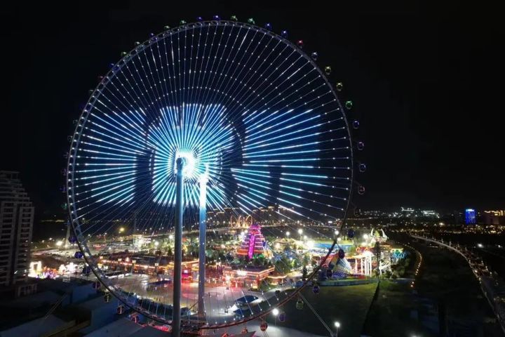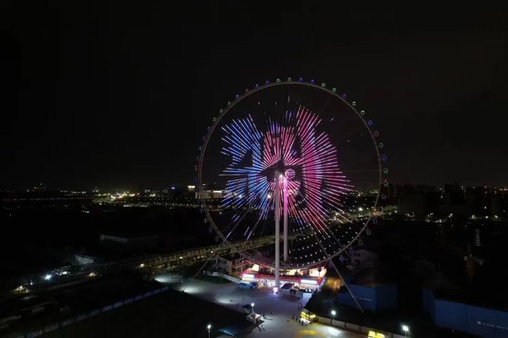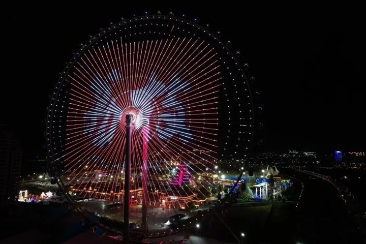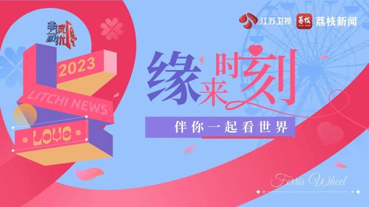 唯美梦幻的摩天轮上闪耀着巨幅“非诚勿扰”“荔枝新闻”“缘来时刻·伴你一起看世界”等字样,一键点亮了属于爱人们的浪漫星空。