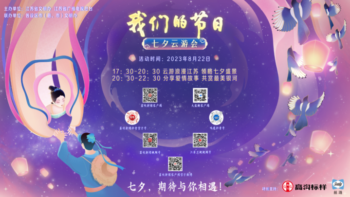 今晚(8月22日),值此中国传统佳节七夕节,由江苏省文明办、江苏省广播电视总台主办,各设区市文明办联办的“我们的节日·七夕”云游会5小时网络大直播将在荔枝新闻客户端、大蓝鲸客户端、荔枝新闻视频号、江苏卫视视频号、荔枝新闻官方微博、荔枝新闻官方抖音号、味道抖音号、江苏音乐广播FM97.5 &FM89.7等平台浪漫来袭!