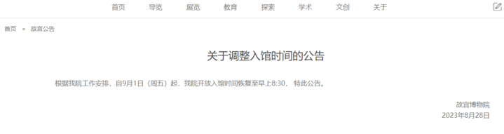 9月1日起,故宫博物院开放入馆时间恢复至早上8时30分 荔枝新闻 2023-08-28 20:06 荔枝新闻讯 故宫博物院网站8月28日消息,根据工作安排,自9月1日(周五)起,故宫博物院开放入馆时间恢复至早上8时30分, 特此公告。故宫博物院网站截图