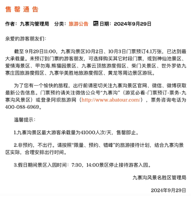 9月29日中午,九寨沟风景名胜区管理局就发布公告称,截至9月29日11:00,九寨沟景区10月2日、10月3日门票预订4.1万张,已达到最大承载量。九寨沟风景名胜区管理局表示,九寨沟景区最大游客承载量为41000人次/天,售罄即止。