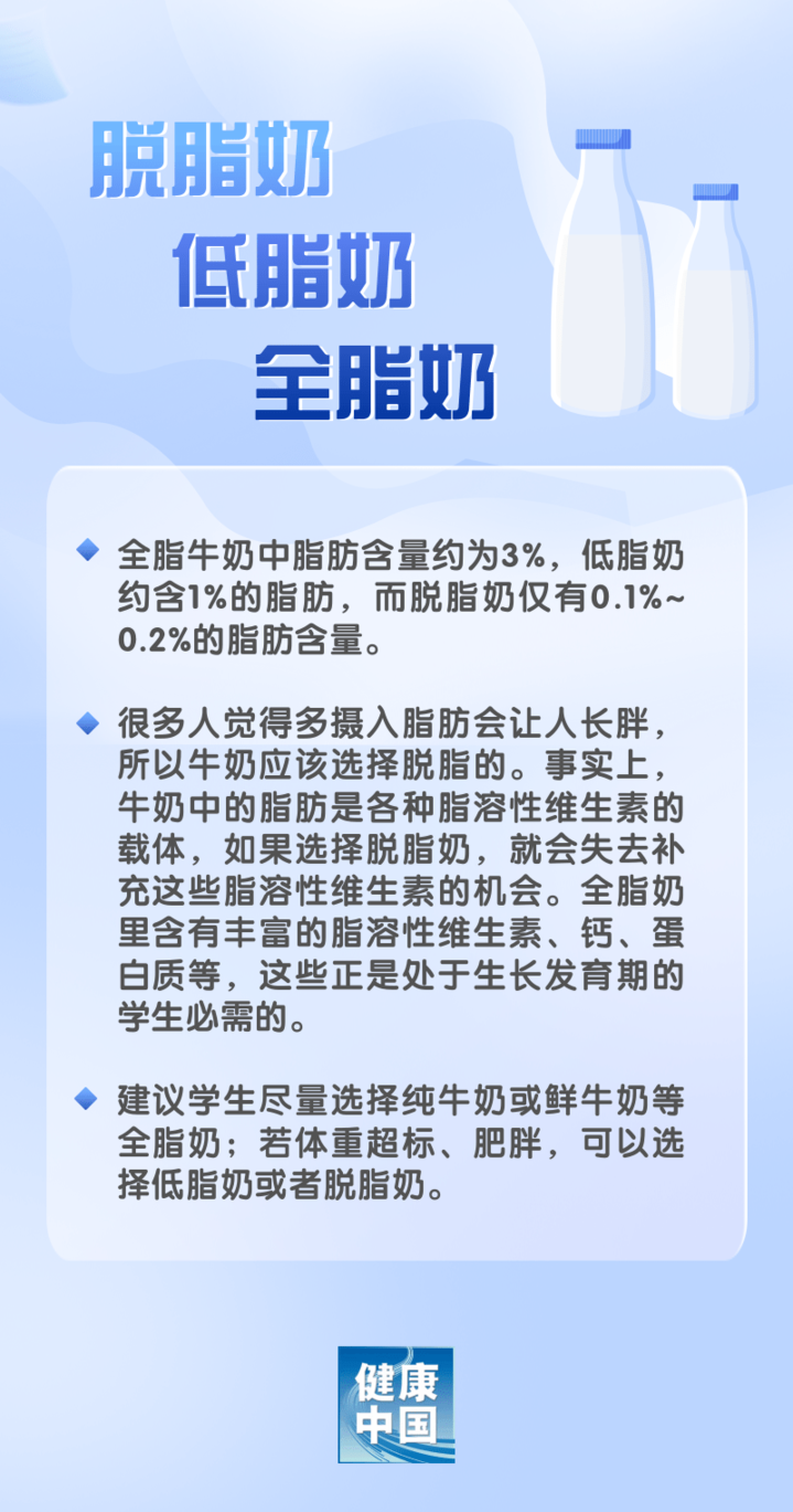 奶及奶制品营养丰富,不仅可以提供优质蛋白质,而且是钙的良好来源。充足摄入奶及奶制品有益于人体健康,尤其有利于肌肉和骨骼健康。儿童青少年需要每天足量摄入奶及奶制品。一般建议学生选用纯牛奶、酸奶来帮助补充蛋白质及钙质,满足机体发育和身高增长的需要。