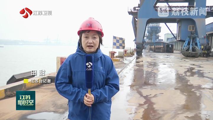 江苏台记者田甜说:“在南京港新生圩港区,此刻缓缓航行、准备靠泊的这艘船是中国籍散货船‘蓉达上海’轮。它船长199.98米、宽34米,装载了56500吨铁矿石,准备在这里卸货。这艘船是南京启动进出南京港船舶吃水提升工作以来,成功靠泊南京港的首艘吃水11.8米的船舶。”