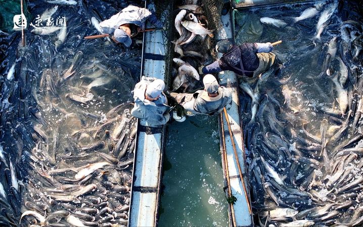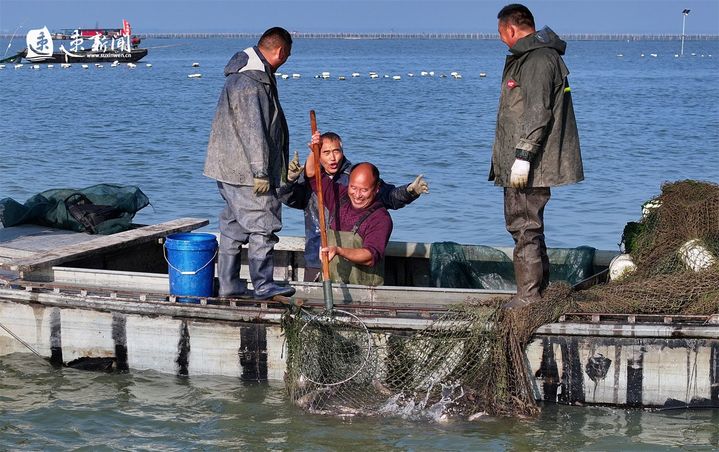 渔民喜笑颜开地捕捞“胖头鱼”。