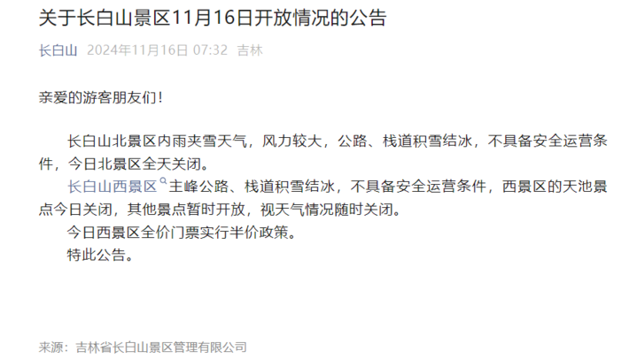 荔枝新闻讯 11月16日,据长白山微信公众号消息,受天气影响,长白山北、西景区的天池景点今日关闭。详情公告如下: