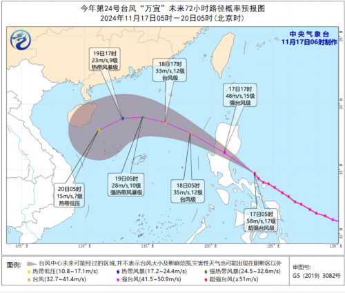 今年第24号台风“万宜”的中心今早(11月17日)5时位于菲律宾马尼拉偏东方向约270公里的洋面上,中心附近最大风力17级。