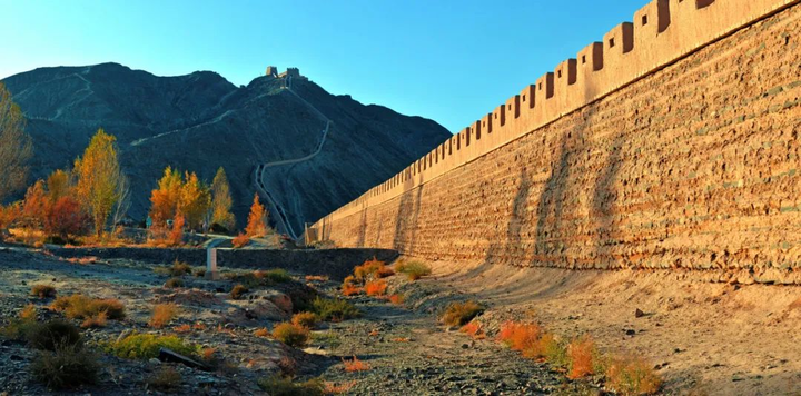 悬臂长城因筑于约45度的山脊之上,形似凌空倒挂,故而得名。悬臂长城是万里长城注入嘉峪关时的最后一条长城,被誉作万里长城的尽头。