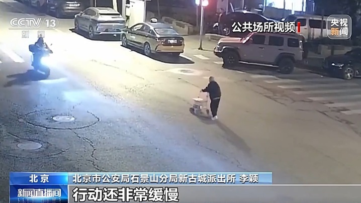 北京市公安局石景山分局新古城派出所 李颖:北京当天刚刚下过小雨,而且刮着风。画面里老人驼着背推着小车,行动还非常缓慢。