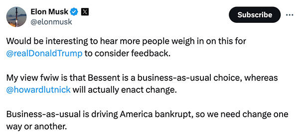 △马斯克在社交媒体表态支持卢特尼克,并@特朗普,让他考虑公众的意见。