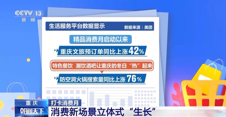 生活服务平台数据显示,精品消费月启动以来,重庆文旅预订单同比上涨42%,特色餐饮、潮饮酒吧让重庆的冬日“热”起来,防空洞火锅搜索量同比上涨76%,云端秋千搜索量同比上涨9倍。新场景、新业态正在让这座山城更有温度更有活力。