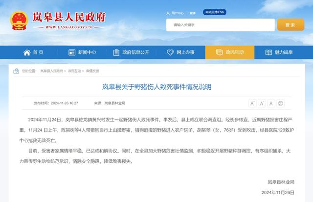 26日,岚皋县林业局就此事发布情况通报称:经初步核查,近期野猪损害庄稼严重,11月24日上午,陈某树等4人带猎狗自行上山撵野猪,猎狗追撵的野猪进入农户院子,胡某翠(女,76岁)受到攻击,经县医院120救护中心抢救无效死亡。目前,受害者家属情绪平稳,已达成和解协议。
