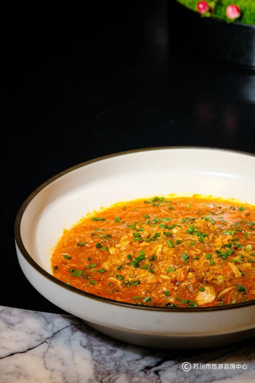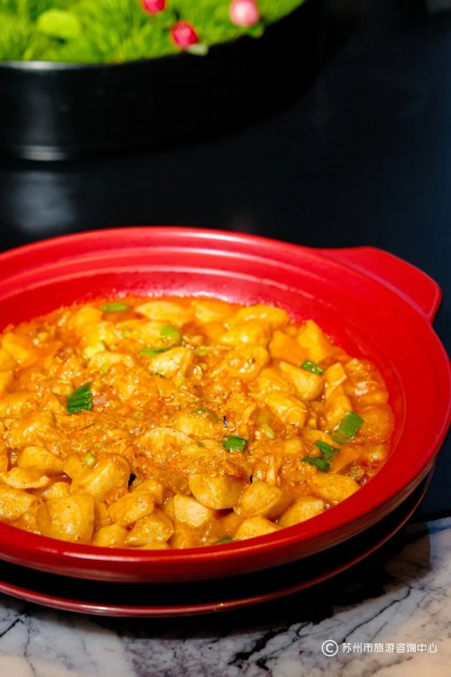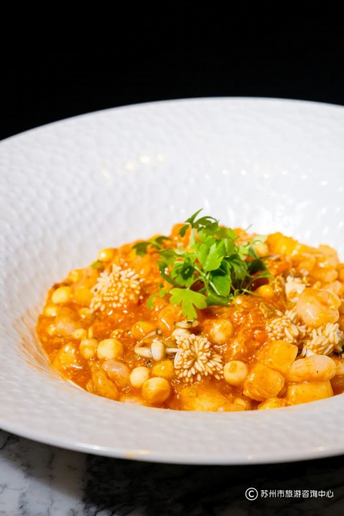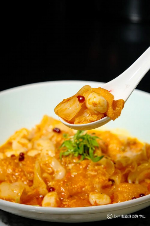 精选苏州本地产的鲜嫩河虾仁和鸡头米,搭配香糯晶莹的小海鲜章鱼籽,煨煮提鲜后再加入蟹粉烩制而成这道创意菜品,河鲜与海鲜相辅相成,呈现“鲜上加鲜”的味觉效果,独特的Q弹口感亦让人印象深刻。还有一颗颗手打年糕散落其间,更是点睛之笔!