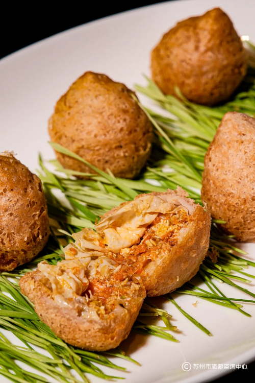 将荔浦芋头切片、蒸熟、拓成茸,再酿入蟹粉做成芋头状。蟹粉外面还包裹着一层腐皮,使得这道点心的口感层次更加丰富。酥脆的外壳将诱人香气紧紧锁住,趁热吃,秋天的快乐就是这么容易得到!