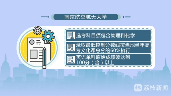 南京航空航天大学计划在江苏等15个省(市、自治区)招收250人左右,选考科目须包含物理和化学,录取最低控制分数线按当地当年高考文化课总分的60%执行,英语单科原始成绩须达到100分(含)以上。