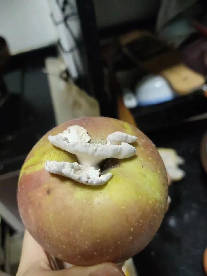 今年7月,家住浙江湖州德清的邓女士,发现自己家里的苹果长出了白色蘑菇。后来,邓女士发布的“果菌王”照片爆红网络,她就顺势将这颗“苹果+蘑菇”赠予了中国科学院昆明植物研究所的科研人员。