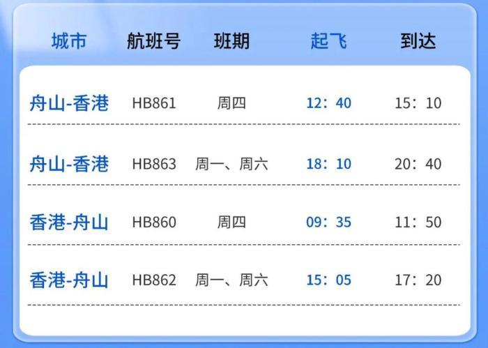 11月7日,浙江舟山至香港航线开通,该航线为舟山普陀山国际机场(原舟山普陀山机场)往返香港国际机场,航班为每周3班。