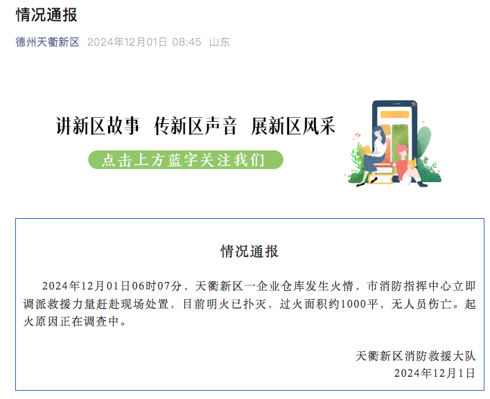 荔枝新闻讯 据“德州天衢新区”微信公众号消息,2024年12月01日6时07分,山东德州天衢新区一企业仓库发生火情,德州市消防指挥中心立即调派救援力量赶赴现场处置,目前明火已扑灭,过火面积约1000平,无人员伤亡。起火原因正在调查中。