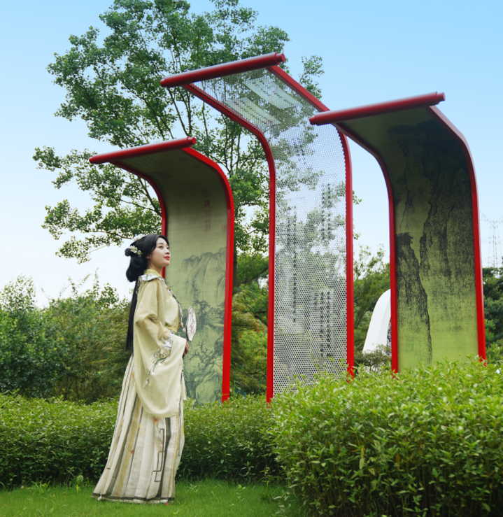 搭配书法画作,与周围花草融为一体