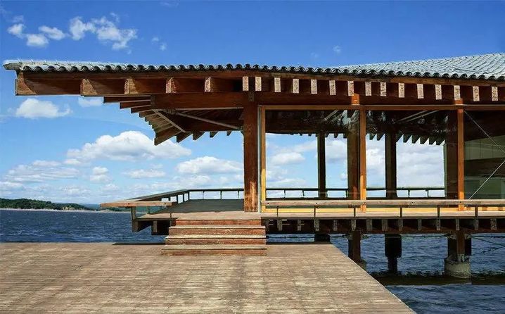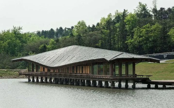 长方形坡屋顶木构房屋与湖水相映成趣
