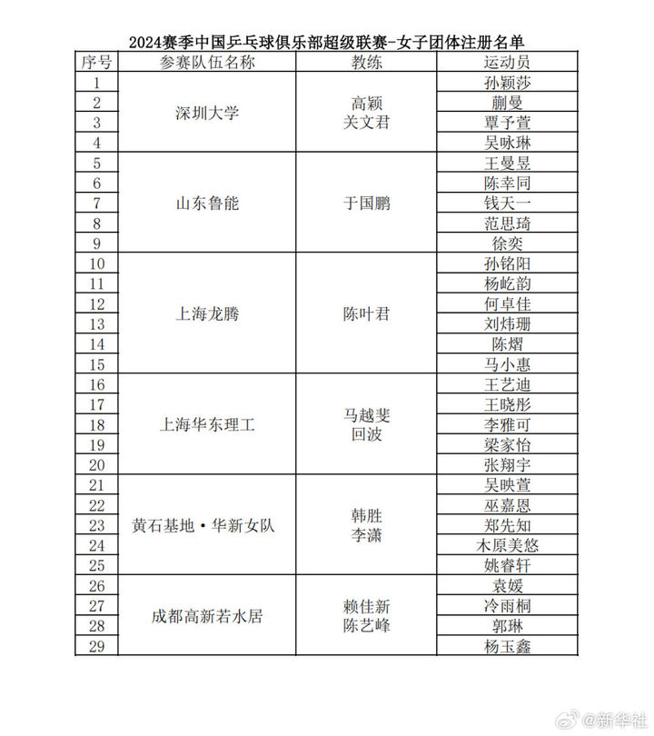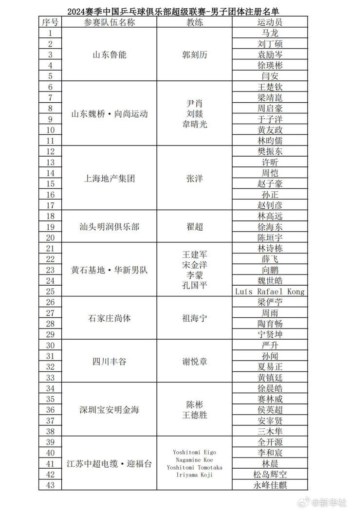 12日至16日,2024赛季中国乒乓球俱乐部超级联赛第一阶段比赛将在湖南长沙举行。各参赛俱乐部的运动员注册名单,以及12日至14日的竞赛日程已经确定。经过单循环对决,男女团体排名前四的俱乐部将晋级总决赛。期待王楚钦、樊振东、林诗栋、孙颖莎、王曼昱等运动员的精彩表现!(记者:谭畅)