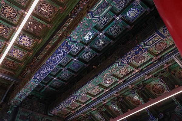 薛俭:屋顶的瓦面是绿色琉璃瓦,在皇家建筑里面黄色琉璃瓦是最高等级,绿色琉璃瓦仅次于黄色琉璃瓦。我们再看它下面的彩绘,这种龙纹的和玺彩绘在皇家建筑的等级也是比较高的,我们再看它下面门窗的窗花,它是采用三交六椀的菱花图案,我们还可以到殿内看到天花板上面的团龙图案天花,这也是等级的一个象征,上面是个龙纹的。