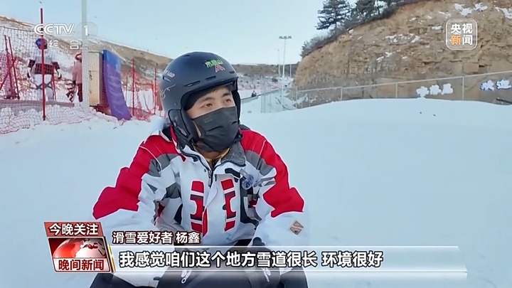 滑雪爱好者 杨鑫:我感觉咱们这个地方雪道很长,环境很好,教练比较专业。