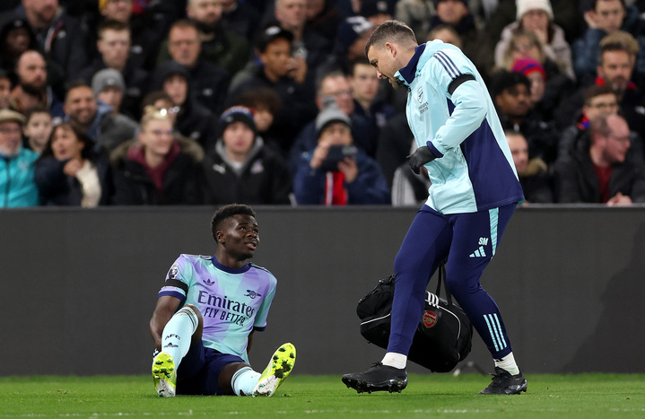 在此前阿森纳5比1大胜水晶宫的比赛中,萨卡在比赛中右腿腿筋受伤被提前换下,随后拄着拐杖离开球场。