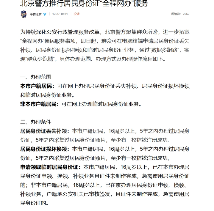 荔枝新闻讯 12月27日,北京市公安局通报,自即日起,群众可在电脑终端申请居民身份证丢失补领、居民身份证损坏换领和临时居民身份证业务,通过“数据多跑路”,实现“群众少跑腿”。