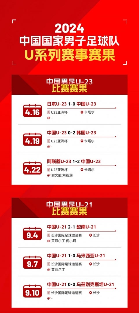 11胜6平6负 U字号国足2024年表现有亮点