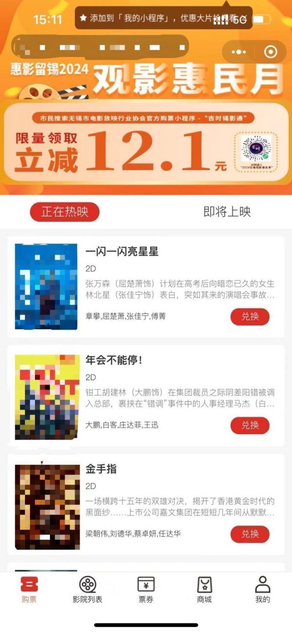 从2月1日起,无锡开展“特惠价观影”、“电影满减券”、“惠民观影专场”、“观影票根打卡”等四重大礼包实现惠民观影活动。其中,“特惠价观影”于2月1日正式启动,分3批次投放优惠券1万张。市民微信搜索无锡市电影放映行业协会官方购票小程序---“吉时锡影通”,点击进入“2024无锡观影惠民月”专题活动弹窗,即可限量领取12.1元观影立减券,最低可以19.9元的价格购买电影票;如选择建行数字人民币支付,可再享更多优惠补贴。“电影满减券”,已经在2024年2月1日起启动。“惠民观影专场”和“观影票根打卡”均于2月10日—24日期间开展,全市影院每天将开设2—3场惠民观影专场,市民可享受优惠票价观影。在这期间,观众可凭活动期间无锡不同影院任何场次的5张电影票根,到无锡市电影放映行业协会免费兑换电影观影券1张。