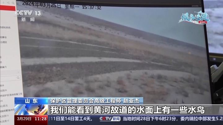 山东黄河三角洲国家级自然保护区管理委员会高级工程师 赵亚杰:这两天风特别大,湿地内好多鸟,平时很常见的一些鸟,可能现在在画面里也很不容易找到。我们能看到黄河故道的水面上有一些水鸟,有可能是䴙䴘类的水鸟。