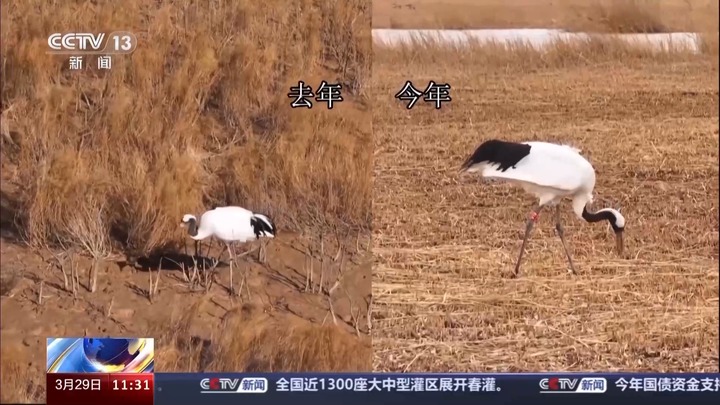 护鸟志愿者 杨斌:明显能看出来,壮了不少。特别是脖子,跟去年对比很明显,“壮壮”今年冬天吃得挺好。目前来看,“壮壮”这些天一直和一个6只的鹤群一起活动,这是一个非常好的开始,但还需要经过长期的观察。