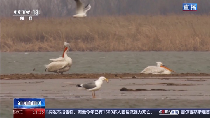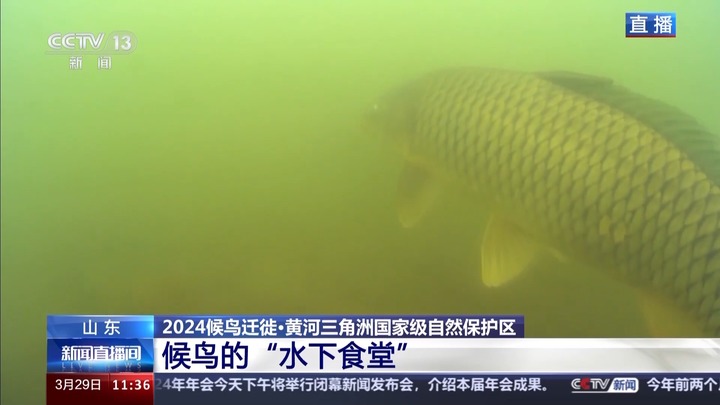 总台记者 贾林:候鸟在保护区玩好了,也得吃得好。接下来,我们通过水下摄像机,一起来看鸟类的“水下食堂”。水下的镜头比较模糊,但仍旧可以看到大大小小的鱼虾蟹真不少,保护区常见的有草鱼、鲢鱼、螃蟹、蛤蜊等等。这样豪华的“水下食堂”其实也是来源于保护区工作人员的努力。以前每到春季也就是现在这个时候,保护区面临春旱威胁,水位下降很快。为了保证鱼类的生存,当地把河湖底部挖深,修建鱼类水下栖息地10处,提高物种多样性。