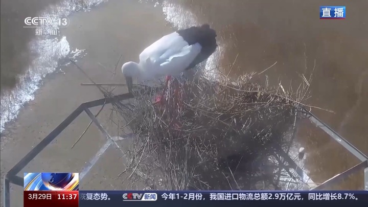 总台记者 贾林:除了丹顶鹤、鹈鹕等水鸟,还有部分候鸟喜欢栖息在较高的乔木上,但是保护区是湿地为主,鸟类找不到高点。为了解决这个问题,保护区修建了113个人工巢,现在人工巢的主要的使用者是“东方白鹳”。通过监控画面可以看到东方白鹳从筑巢到形成家庭,再到抚育幼鸟的全过程。大家看到画面中扇动翅膀的亲昵行为,是东方白鹳求偶行为。这两只东方白鹳还成功孕育了一窝小鸟。近年来,保护区内东方白鹳数量大幅度增加,2023年东方白鹳繁殖198巢450只幼鸟。