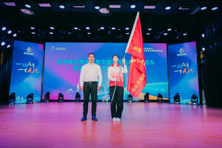 在全场的见证下,共青团南京市委员会副书记王军向南京文旅职教集团青年代表授“南京职教文旅青年志愿服务总队”队旗。
