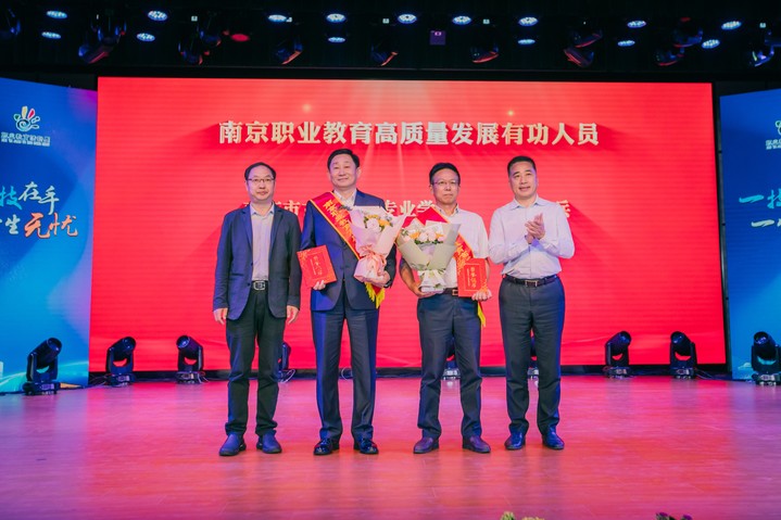 现场,南京市政府副秘书长戴兴海,南京市教育局局长、党组书记、市委教育工委书记吴秀亮为获得“南京职业教育高质量发展有功人员”的教师颁奖并合影留念。