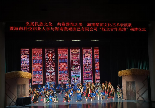 揭牌仪式后,双方共同展演了以“弘扬传统文化,共赏黎苗之美”为主题的一系列精彩节目。情景剧《阿贵与额娘的传说》深情地演绎了黎族、苗族的历史传说,舞蹈《黎谣》则以曼妙的舞姿展现了黎苗文化的独特韵味。这些节目不仅融合了海南科技职业大学教育与音乐学院师生的智慧与才华,更借助了海南微城演艺公司的专业资源,使得传统艺术形式在现代化舞台上焕发出新的光彩。