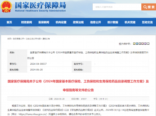 国家医保局已于当日公布《2024年国家基本医疗保险、工伤保险和生育保险药品目录调整工作方案》及申报指南等文件。