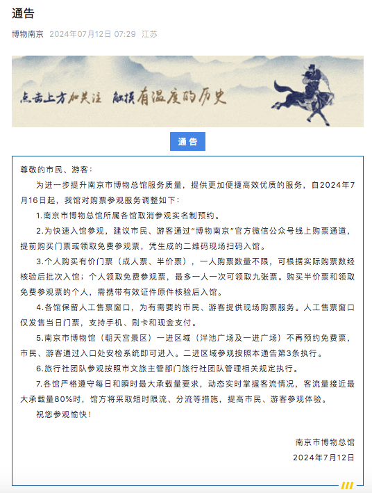 为进一步提升南京市博物总馆服务质量,提供更加便捷高效优质的服务,自2024年7月16日起,我馆对购票参观服务调整如下: