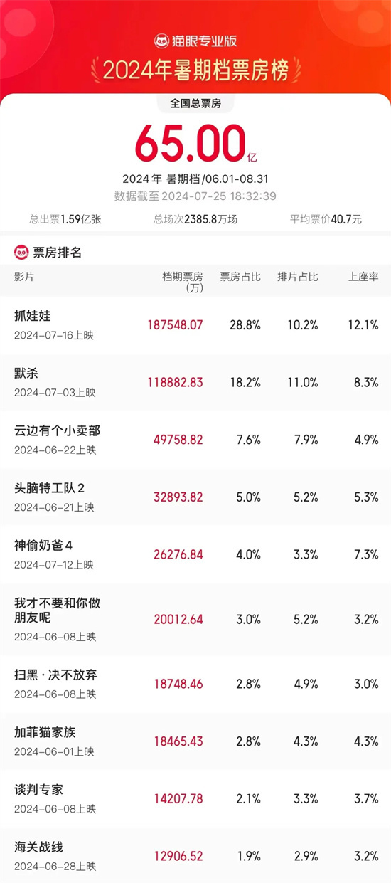 2024暑期档电影票房破65亿 《抓娃娃》暂居榜首