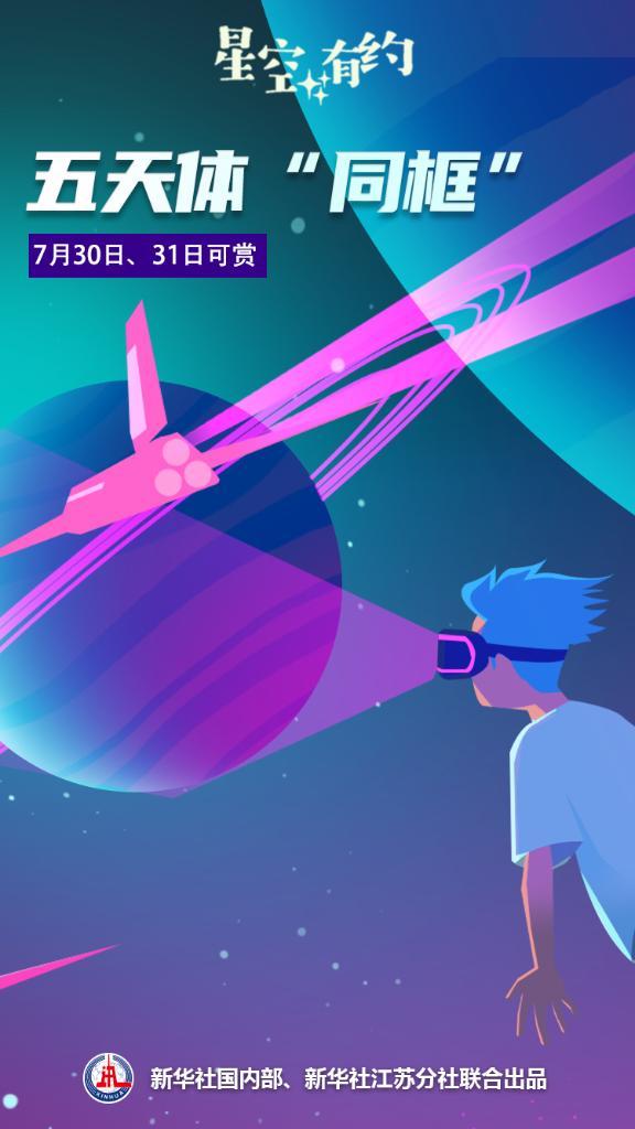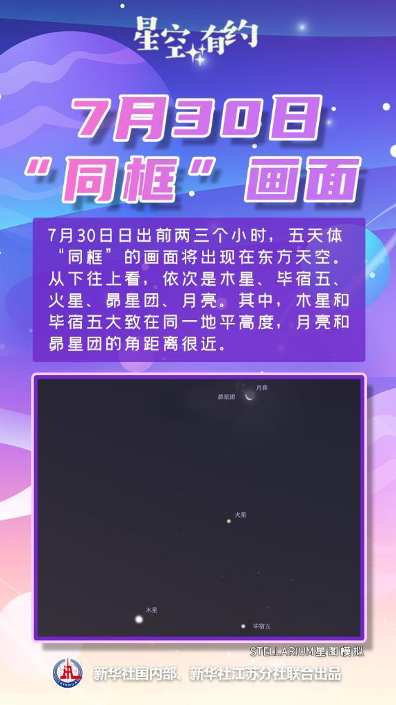 中国科学院紫金山天文台科普主管王科超介绍,7月30日日出前两三个小时,五天体“同框”的画面将出现在东方天空。从下往上看,依次是木星、毕宿五、火星、昴星团、月亮。其中,木星和毕宿五大致在同一地平高度。