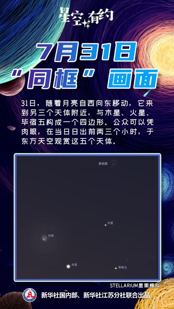 7月30日至31日,我国黎明前的夜空会出现火星、木星、毕宿五、昴星团和月亮“同框”的画面,感兴趣的公众可以一观。