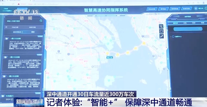 就在车辆在隧道内缓慢通行的同时,在约20公里外的深中通道路网调度中心,路政、交警、监控等工作人员通过这里的智慧交通系统,实时了解到了隧道里的通行情况,同步展开调度指挥。